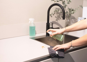 Кухня: Мытье раковины и рабочей поверхности. Протирание фасадов мебели и бытовой техники снаружи (плита, холодильник, микроволновка).